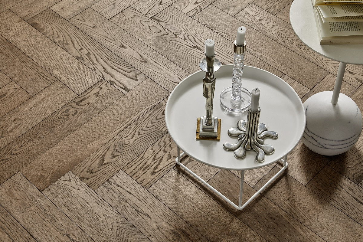 Herringbone parquet oak, Tarkett, Segno Oak Old Grey, brushed, beveled, hardwax oil, left modular