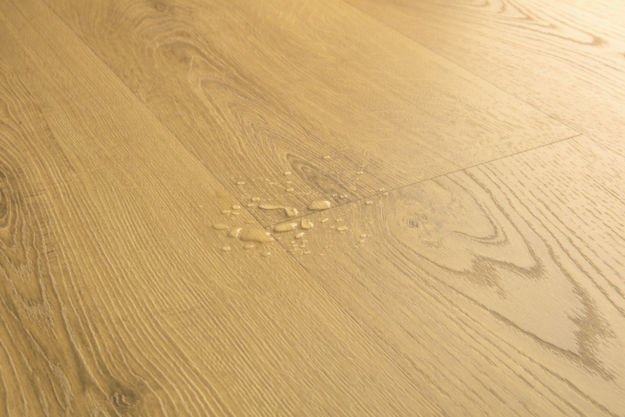 100% veekindel laminaatparketi pind. Jäta hüvasti niiskusprobleemidega. Quick-Stepi veekindlatel laminaatparkettidel on uuenduslik, vetthülgav “HydroSeal” kaitse isegi ühendustes, nii et vesi ei pääseks sisse.