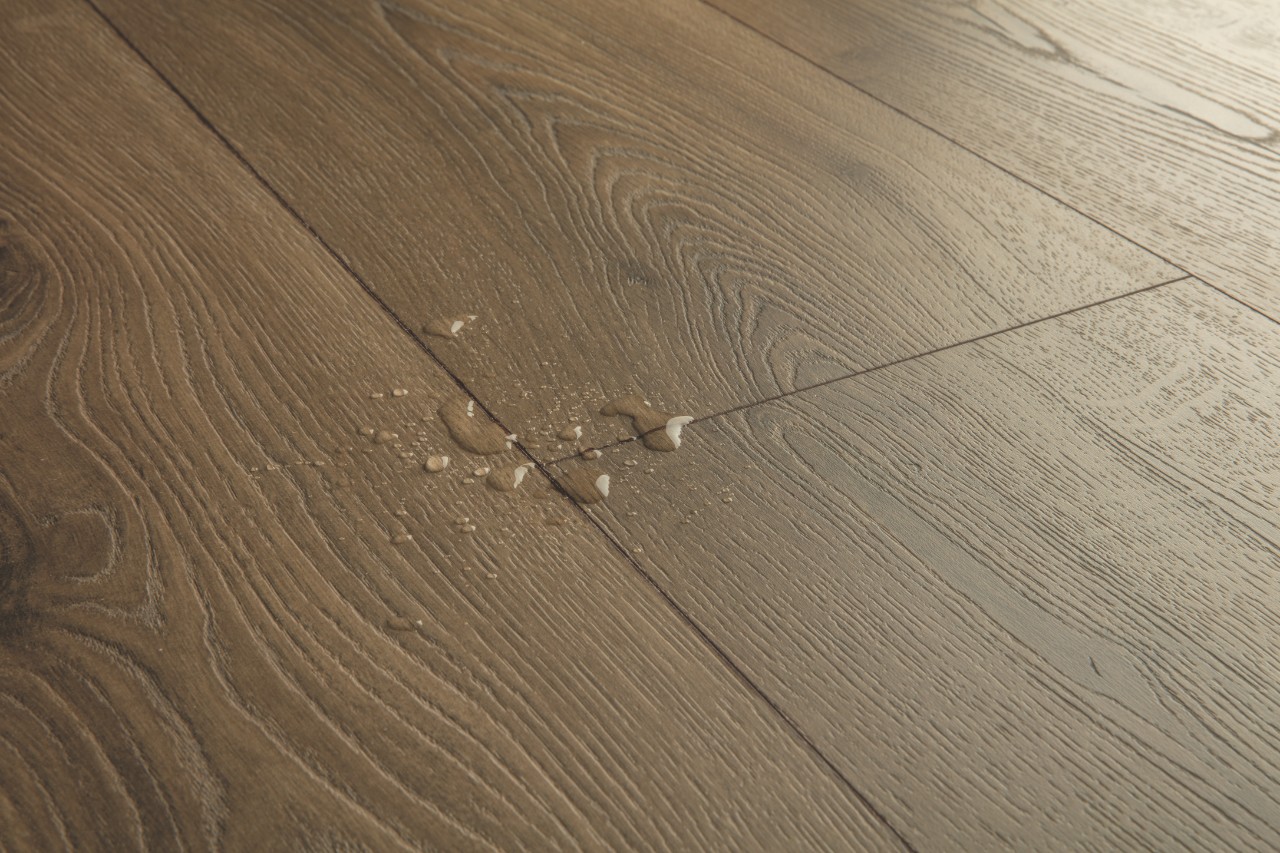 100% veekindel laminaatparketi pind. Jäta hüvasti niiskusprobleemidega. Quick-Stepi veekindlatel laminaatparkettidel on uuenduslik, vetthülgav “HydroSeal” kaitse isegi ühendustes, nii et vesi ei pääseks sisse.